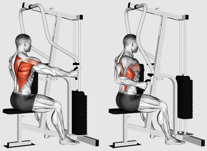 बैठी हुई पंक्ति मशीन. पीठ की मोटाई बढ़ाने के लिए एक महत्वपूर्ण व्यायाम। 8-12 प्रतिनिधि के 4-6 सेट करें।